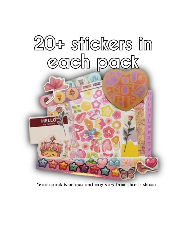 Each pack includes 20+ stickers of various types, and may* include die-cut, sticker sheets, transparent, holographic, alphabet, or character stickers.
